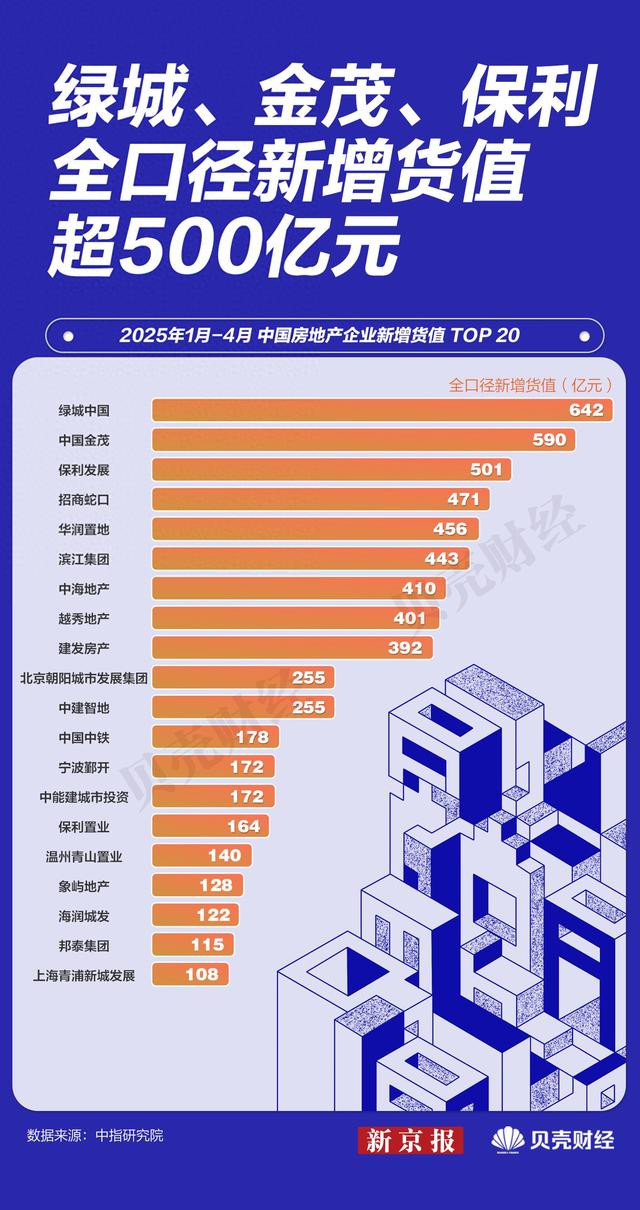 从新增货值来看,绿城中国、中国金茂和保利发展位列前三。2025年1-4月,绿城中国以642亿元新增货值占据榜单第一,中国金茂以590亿元新增货值位列第二,保利发展新增货值规模为501亿元,位列第三。TOP10企业2025年1-4月新增货值总额4561.6亿元,占TOP100企业的43.5%。